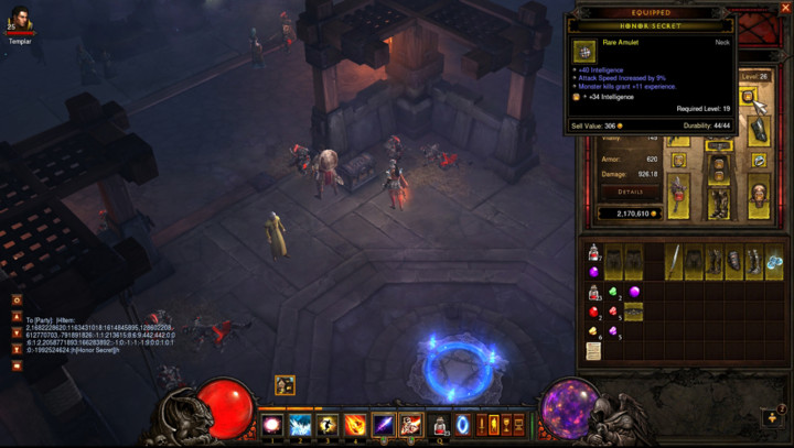 Hotlinking items (shift+left click) seems to be buggy with the latest 1.0.2c patch. It happens most commonly with socket items; in this case my socket amulet, and spits out a long string of text instead of the item hotlink.