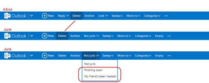 I like Outlook.com (revamped Hotmail), but there's an inconsistency in the Outlook.com's user interface which kind of bugs me. When switching from the inbox to the junk page, the "Delete"-button shifts to the left. If I'm in a hurry deleting emails from my inbox and junk, switching between the pages will cause me to accidentally pressing the "Archive"-button when I actually want to delete the email. Also, there's the weird categorization where they put the options to flag the junk mail message as "Phishing scam" and "My friend's been hack!" under the button "Not Junk"... Isn't that the opposite?
