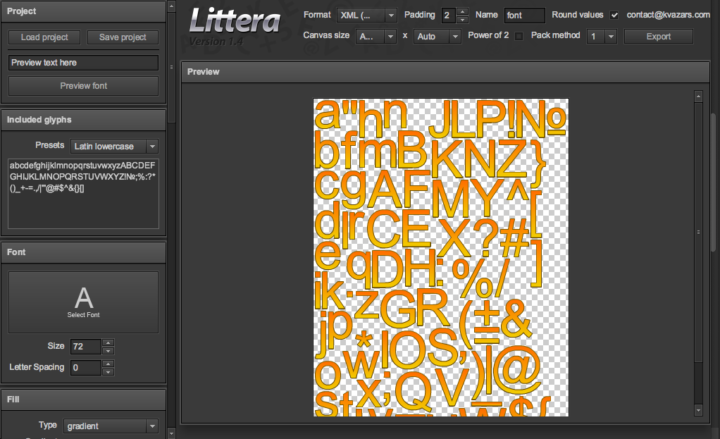I used to use BMFont to generate bitmap fonts for Unity3D when my Windows laptop was still working. It's still out at the repair center waiting to be fixed, so I've been working on a Macbook ever since. Unfortunately, BMFont is only available for Windows, but I found a great alternative called Littera. It's a web application to generate bitmap fonts and it has numerous awesome extra features such as adding gradient, stroke, shadow, bevel, etc. Generating a bitmap font is very straightforward. You just upload a font set the desired size, resolution and format, and export it!